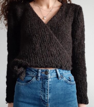 Shorter-style wrapped jumper with ties worked bottom up with 10 mm single pointed needles. Cozy but chic cardigan that goes so well with high-waisted jeans. It requires a little bit of sewing, since all the different parts are knitted separately. Really easy knitting pattern!