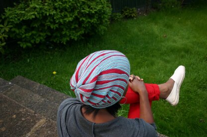 ShortStuff is a garter stitch slouchy beanie. It is made with short row stripes that meander from side to side, using 2 or 3 colour yarns to create a unique and fashionable hat.