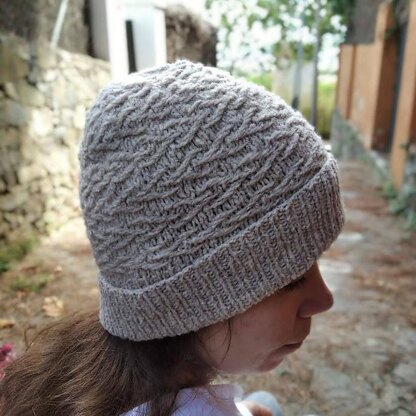 The hat is knitted in the round from the brim upwards on a short circular needle. Switch to double-pointed needles when needed or use the magic-loop technique using a longer cable.