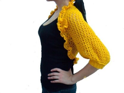 The shrug is handknitted with crocheted edges. The floral brooch is crocheted and removable. Skill level: Easy/ Intremediate
