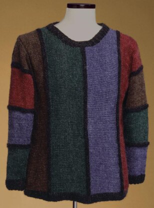This easy sweater is worked from side-to-side – no intarsia needed for the stripes! The sleeves are picked up and knit down from the armholes. And there is a coordinating children’s pullover pattern (#148) so you and your child can match!
