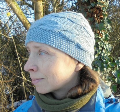 This hat is knitted sideways, which allows for interesting sideways cables. The merino yarn has a lovely soft sheen which really shows off the stitch pattern, whilst of course keeping the wearer warm and snug.
