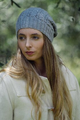 A twisted rib and lacey slouchy hat… fine, delicate and warm finished off with a pompom. Knitted in 4ply/fingering yarn on 3.25mm (3 US) needles