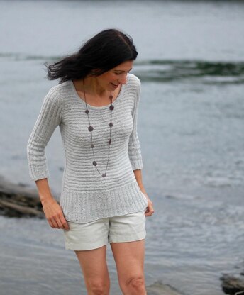 Light, fashion-forward, and perfect for coastal summers and fall, this pullover is all about texture at a eased gauge. Worked in one piece from the shoulders-down and almost entirely in the round, the 2x2 ribbing on the back and sleeves contrasts with double garter st on the front. The set-in sleeves are created seamlessly with the upper bodice in a technique originally described by Barbara Walker (photo tutorial included).