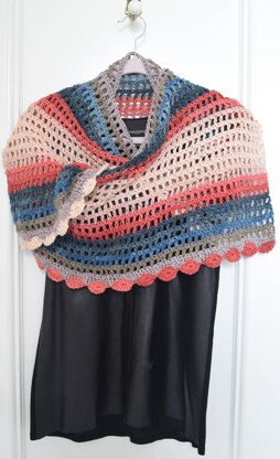 Beautiful colors and a smooth, silky drape combine in this rectangular shawl with a curved motif border.