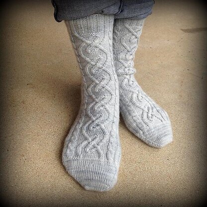 This top-down cabled sock is written in one size, and is relatively stretchy due to the ribbing. Two options for leg length are provided.