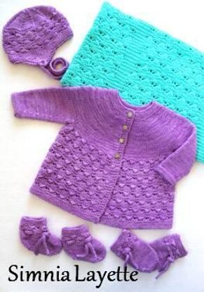 Simnia Layette includes the patterns for: Cardigan, Blanket, Hat, Mitts, Booties.