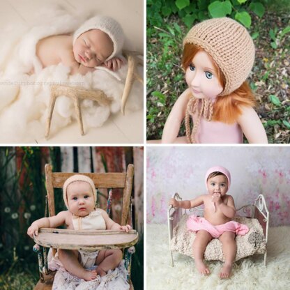 This knit bonnet pattern from Lily B's has been created with the knitting photographer and photography prop vendor in mind (for use as a photo prop during photography sessions). Digital pdf download. :: KNIT BONNET PATTERN ~ SIMPLE BONNET :: 5 SIZES SIZE: Preemie (fits most 18" dolls), Newborn, 0-3 Months, 3-6 Months, 6-12 Months SKILL LEVEL: Beginner, this bonnet is knit flat, then seamed YARN WEIGHT: #4 Medium worsted NEEDLE SIZE: 5mm (US8) TECHNIQUES USED: Knit, purl, and knitting two stitches together. TIE OPTIONS: Crocheted ties LANGUAGE: English TERMINOLOGY: Standard US