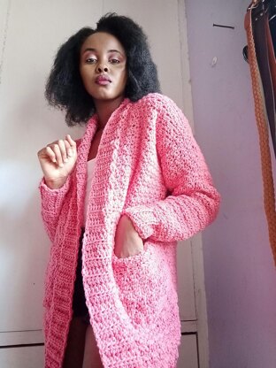 This cardigan is meant for a female size medium, but it can be adjusted by increasing or decreasing the number of rows. Skill level: easy. The pattern mostly consists of lemon peel stitches.