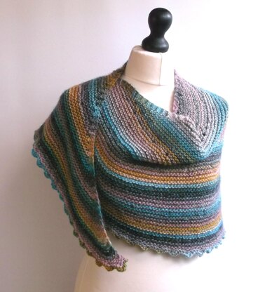 Worked top down completely in garter stitch, this shawl pattern would suit a beginner plus. Starting with a garter tab cast on and then using yarn overs for increases. Finishing with a pretty picot bind off. Knit with just one ball of self striping yarn.