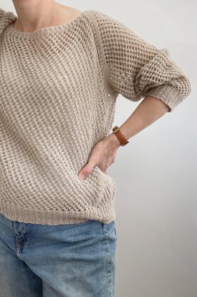 The simple lace pattern in this pullover creates a textured, bias-type fabric that gives a soft drape to its’ casual fit. Columns of stockinette stitch at the raglan, side and sleeve “seams” lend structure to the airiness of the lace. This pattern calls for a fingering weight yarn held together with a lace weight mohair blend yarn to allow the fluffiness to “fill in” the eyelets and produce a garment that is lightweight yet warm. Alternatively, a worsted weight yarn with a fluffy/hazy characteristic can be held single throughout.