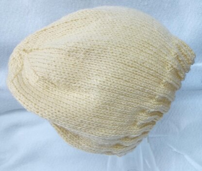 This is my standard DK hat, but without the turned over edge (if you want that, add more rows of rib and turn it over) and with more rows in the body and a slower decrease so that it ‘slouches’. Done on slightly larger needles to be softer/looser. It was requested by one of my teenaged students. I love the fact that the decreases for the top spiral in to the middle – it shows more if the colour of the yarn is plain – it just adds a pretty bit of detail. See the variations for ways to use stitch patterns to make these more interesting, but they won’t be quite as fast to finish. Make it with a patterned or mottled or shaded yarn for a fancy-looking gift that was easy to do but is hand-made for your someone who appreciates that kind of thing.