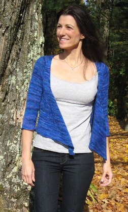 Perfect for those times when you need a little something to take off the chill, Simplicity is a lightweight, flyaway cardigan that can be worn either tied at the waist or with the fronts gently draped to the sides. Knit seamlessly back-and-forth from the top (neck) down to the hem, with raglan 3/4 sleeves, it is intended to be worn with 0-2” of positive ease at the bust (ie. 0-2” larger than the actual bustline). The lower back edge of the bodice is shaped with short rows.