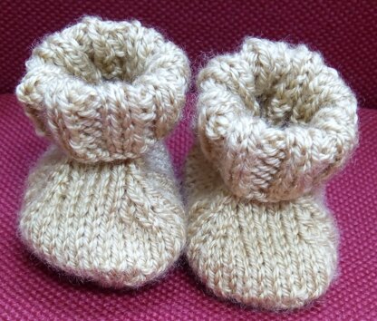Hello folks. I made some booties for a colleague whose partner had had a baby (I hadn’t known she was expecting, and I needed a quick gift), and I found the pattern I used was unnecessarily fiddly. This one is simplified, and has a seam along the bottom and up the back, but since it is for a newborn-to-six-month size, the kid won’t be walking and so it shouldn’t matter, as long as you do the seam neatly so it doesn’t rub. Most parents would probably put socks under booties anyway, especially in cold weather.