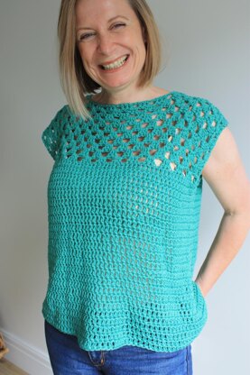 This cool and breezy crochet top is so easy for beginner crocheters. It is crocheted in one piece from the top down so there are no seams. The pattern is chock full of images to help you along but once you have mastered your double crochet/chain pattern repeat it is a very easy project to work on.