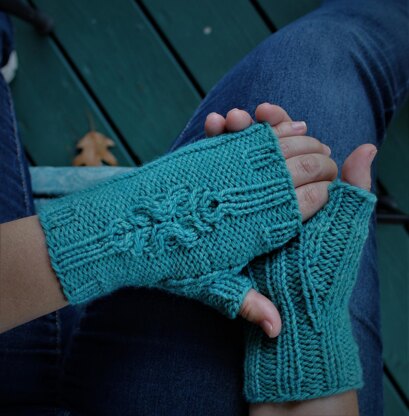 These mitts combine two of my favorite design elements: ribbing and cable medallions. I just love the pop of the cables on the back of the hand in what are otherwise pretty simple accessories. The mitts coordinate with a hat of the same name.