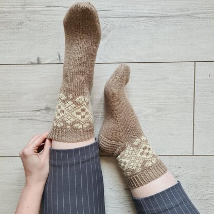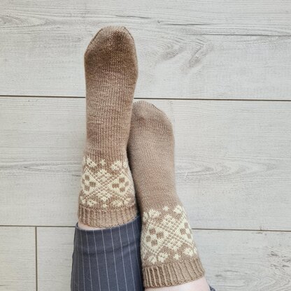 The Sinope socks are worked cuff down with two heels to choose from. They feature a geometric colourwork motif on the leg which comes charted in two contrasts to be easier to follow no matter your colour choice.