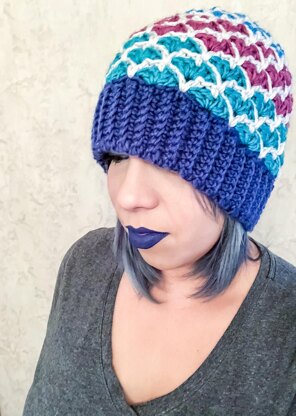 My Sirena's Hat is inspired by mermaids and ocean waves. "Sirena" is the Spanish word for mermaid. Is made with 60% acrylic, 20% nylon, and 20% merino wool of the new Caron x Pantone yarn collection.