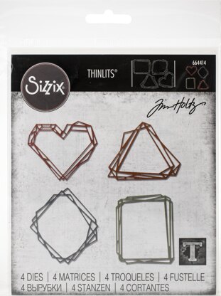 Thinlit dies offer a variety of affordable solo options or multi die options. Thinlits are easy to use and are compact and portable. These dies are compatible with Sizzix BIGkick, BigShot and Vagabond. This package contains Geo Frames: a set of four metal dies. Approximate die-cut size: between 2.75x2.25 inches and 2.75x2.375 inches. Designer: Tim Holtz. WARNING: Choking Hazard. Not suitable for children under 3 years. WARNING: May contain items with sharp edges. Handle with care. Imported.