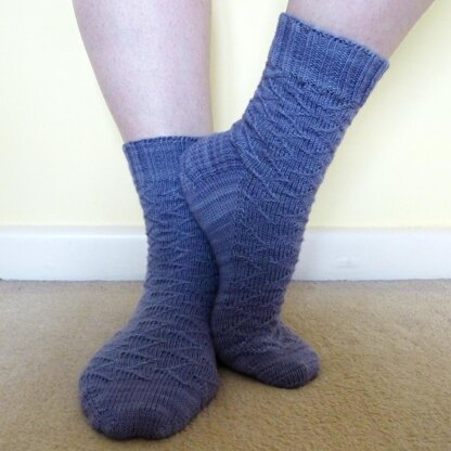 This toe-up sock has an attractive, slipped-stitch jacquard pattern, which is ideal for yarns with lots of colour changes as well as for solid colours. The sock is made with a traditional flap heel and gusset construction, with some extra cushioning under the heel.