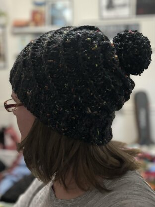 A simple pattern of yarn overs and slip-slip-knit decreases spiraling up the body of this hat gives a wonderfully stretchy texture that looks super cute with or without a pompom attached. Made with less than a full ball of Lion Brand Heartland yarn, this hat comes together super quickly, making it great for last-minute gifting or a relaxing weekend project.