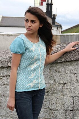 The cardigan is knitted from the bottom up in rounds, starting with a picot hem. The front opening and armholes are steeked. The sleeves are knitted from the top down with short row shaping for the sleevecaps.