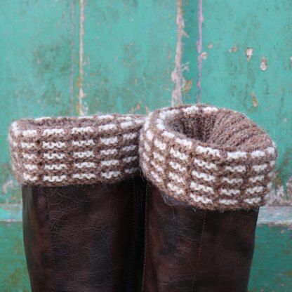 Perfect for using small amounts of double knit yarn these two colour boot cuffs use simple techniques to make a striking accessory. Worked in the round.