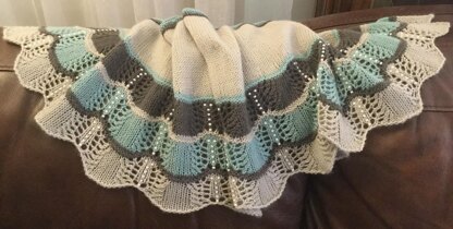 This shawl reflects the simplicity of the stones skipping across the lake. The ripples, the stones represented by beads, and lace for accents. I wanted a design that would define the feeling of being outdoors and enjoyment. I think this design is spot on.