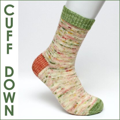 This is a cuff down sock pattern, worked in one piece, from the cuff down to the toe. Casting on requires using a stretchy cast-on method. The cuff of the socks is knitted first, before moving onto the leg, the heel, the gusset, then the foot and finally finishing on the toe. Kitchener stitch is used to close the stitches at the toe.