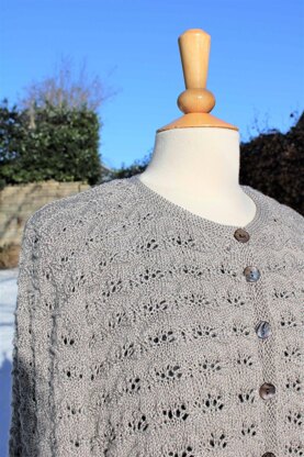 Skumtop is an A line cardigan worked from the bottom edge and up with a textured lace pattern on the body. The cardigan has long set in sleeves (the yoke is worket in one piece / raglan construction).