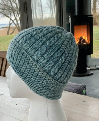Difficulty: Advanced beginner. The hat is mainly knit and purl stitches, with some simple cables. It is a good introduction to cable knitting. It is worked in the round.