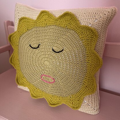 When making this sun pillow, I decided to add a face to the sun. My family said that it looks like she is sleeping, so I named this pillow, the Sleeping Sun pillow. Surface crochet is used to create the face. There is a photo tutorial to explain this process. The back of the pillow is a traditional granny square. Five buttons hold the pillow together, so it can be taken on and off the insert.