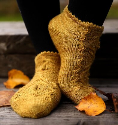 Sleight of Hand is a sock pattern for cable lovers. The socks are worked cuff down and start off with a cute picot border. The design features a quick and easy heel construction with short rows. The socks are ankle high, but the leg can easily be worked taller.