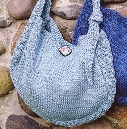 "A casually elegant bag that's easy to knit. The front and back pieces are knit in twisted stockinette stitch; the sides and strap are worked in one piece in a cable pattern."