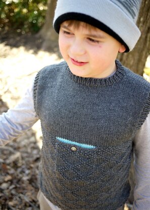 SLINGSHOT is a ready-for-play sleeveless sweater vest featuring rugged diamond brocade and a center chest pocket. Sweater is worked bottom up seamlessly in the round before front and back are divided and worked separately to shoulders; shoulders are joined with 3-needle bind off to complete the seamless construction.