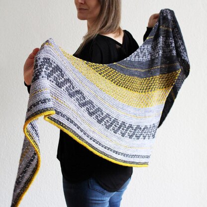 This shawl is all about slip-stitch and mosaic knitting. It combines garter stitch with some fun-to-knit colourwork elements.