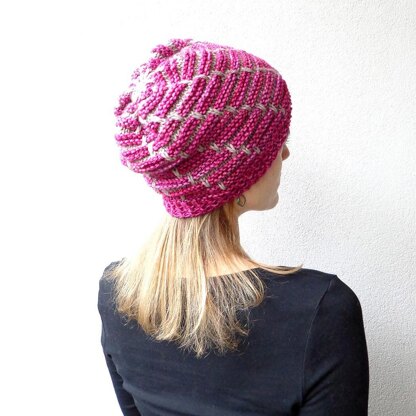 A slouchy beanie-style, fun to knit hat with a fabulous textured stitch pattern that swirls around the head :)