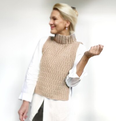 Modisches Statement oder einfach nur praktisch? Vielseitiger Kombipartner gerade in der Übergangszeit für angenehme Wärme und gleichzeitig Bewegungsfreiheit. Als Slipover unter einem Blazer oder als Pullunder über einer leichten Bluse. Rasch gestrickt mit außergewöhnlicher Linienführung und raffiniertem Muster. Maße, Garnmengen, Skizze > letztes Bild