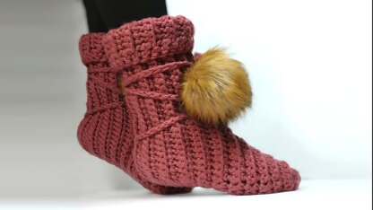 The cozy slipper boot pattern we are working on today is easy enough for beginners but it is so stylish that it looks like you spent a lot of time and energy on it. The hardest part about this project is deciding on the colors you want to use. I chose one of my favorite new yarns Lion Brand’s Hue + Me. This #5 bulky yarn will have your feet in heaven.