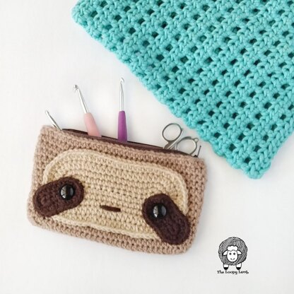 This sloth hook case is a quick and cute project that is accessible for beginners. It can be used as a hook case, a clutch, pencil case or make up bag. The finished case is approximately 4.75 inches tall x 8 inches wide.
