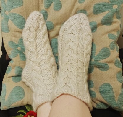 Knitted on double pointed needles, these slouch socks have cable detail on the cuff, heel, and top. The sole is purled. Warm, soft and snuggly, ideal for relaxing in after a hard day. Can be knitted in any chunky yarn that knits to the same tension.