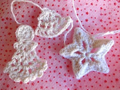 Cute small decorations for Xmas, include: angel, bell, star, snowflake and motif. Continuous crochet without sewing, it’s easy and quickly to make. You can make all of them in only 30 minutes. Gauge does not important; you can use any yarn you like. Finer weights will make it smaller, bulkier weights will make it bigger. You can stiffen this by spray starch, it can be wash and re-starch. Hope you enjoy it :)