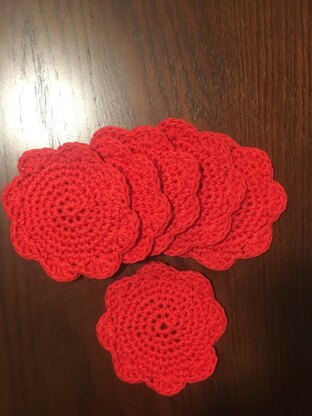 This coaster is made with 20 yards of yellow and 1 yard of black worsted weight cotton yarn. It is made in a round spiral of sc stitches with a shell edging of dc stitches added. A stitch marker is used to keep track of the end of each round. The smiling face is embroidered on the front with black after the coaster is crocheted. This is an easy pattern, so please give it a try.