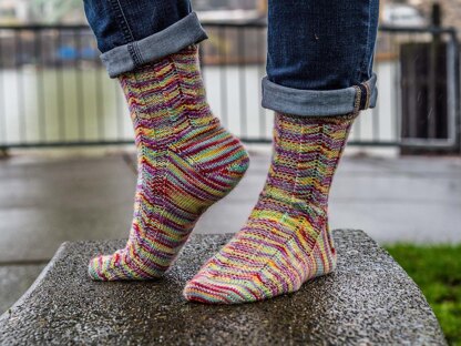 Sure, we all have way too many irons in our personal fires. That's why we are so lucky it takes a loooong time for iron to burn, huh? Go ahead, channel your inner blacksmith and put another iron in your knitterly fire by casting on these socks. They knit up quickly, with an easy-to-memorize chevron pattern that is elevated by that highly variegated skein of sock yarn that's been winking at you from your stash.