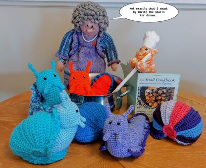 Fine white and black yarn for eyes The worsted weight yarn is used for the shell and the light worsted weight yarn is used for the snail.