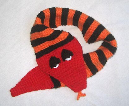 A sleepy looking snake to wrap around your neck – plenty long enough for an adult as well as a child. Looks great in all sorts of colours. One of a series of scarves for children (and adults with a quirky sense of humour!). All have a head with a mouth that you can thread the tail through.