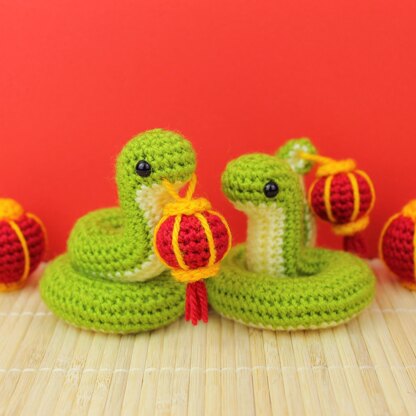 The snake needs no wire for its coiled pose - all shaping is built right into the crochet fabric. No turned rows or tall stitches, so nothing breaks the smooth single crochet surface. And while the contrast color belly is built in, the only actual color change is in one of the lanterns, the snake requires none!