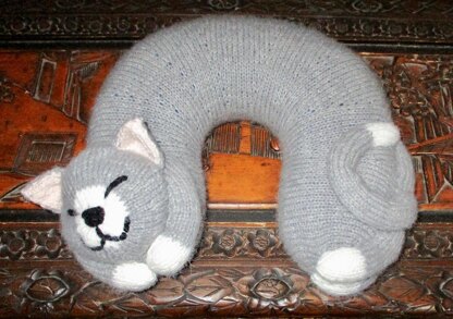 This knitted cover is made to fit U shaped travel pillows and is stretchy enough to fit a range of sizes. Custom design your cat – samples were made as a grey cat with white tips and a Siamese kitten, but it could be ginger, black, white, pink... (but not stripes).