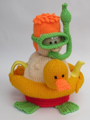 The Snorkeler Tea Cosy is wearing a snorkel mask and big green flippers and a duck inflatable ring around his waist. He has red trunks on, but you could knit them in any colour you choose.
