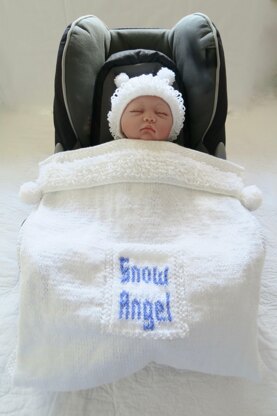 Snow Angel 3-12 month car seat blanket & hat. A unique design for a very special baby and a perfect baby shower gift that will delight any new mother to be. The blanket will keep the baby snug with the added benefit that it stays in place and does not slip or ride up as its secured by the lower strap without interference.